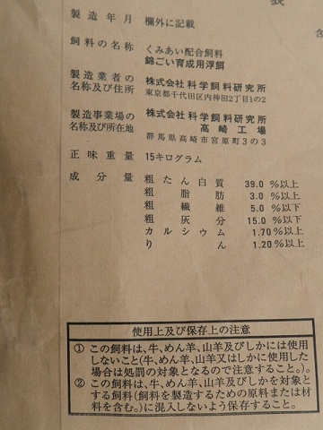 動物質性飼料(魚粉)41%、穀類(小麦粉)31%、植物性油かす類(大豆油かす・コーングルテンミール)14%、そうこう類(米ぬか油かす)10%、その他(りん酸カルシウム・ニンニク粉末・甘草抽出物・ビフィズス菌体末・食塩・ブドウ糖・炭酸カルシウム)4%
