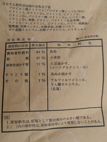 動物質性飼料(魚粉)41%、穀類(小麦粉)31%、植物性油かす類(大豆油かす・コーングルテンミール)14%、そうこう類(米ぬか油かす)10%、その他(りん酸カルシウム・ニンニク粉末・甘草抽出物・ビフィズス菌体末・食塩・ブドウ糖・炭酸カルシウム)4%