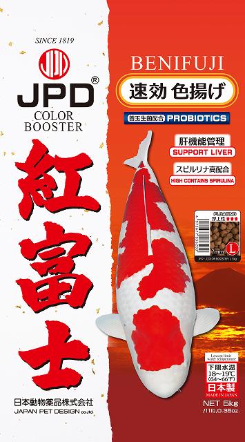 「赤富士」をベースに短期間での色揚げを狙ったスピルリナ高配合飼料です。錦鯉の色揚げに優れた効果を示す、ファフィア酵母(アスタキサンチン源)・パプリカ輸出物(ゼアキサンチン源)・コーン(ゼアキサンチン源)を配合したプレミアム色揚げ飼料です。
